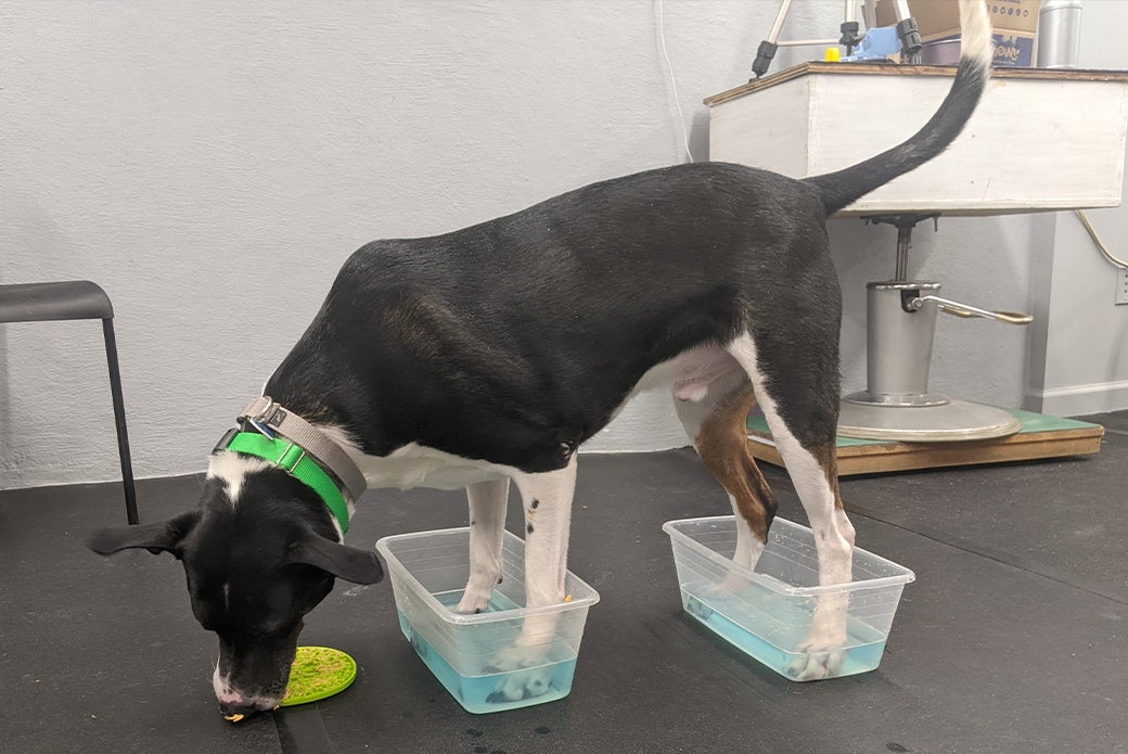 Bugs’ stress also impacted his physical health, including skin allergies and abrasions. Inflammation on his paw pads prevented him from going on walks, and he required medicated baths and foot soaks.